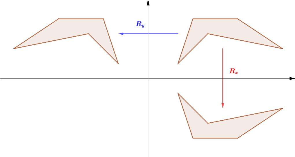 - Considere as transformações Rx e Ry, correspondentes a uma reflexão em relação aos eixos x e y, respectivamente. Elas estão ilustradas a seguir.